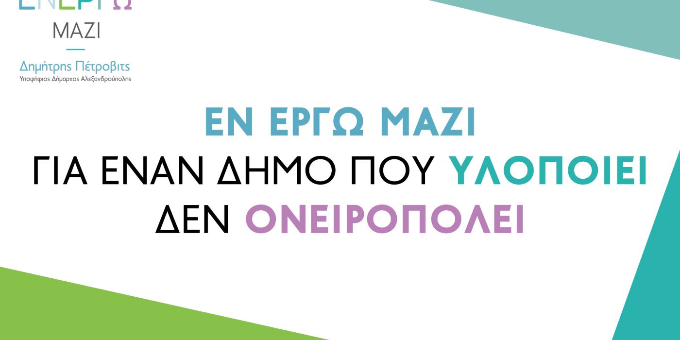 Με προορισμό έναν Δήμο Αλεξανδρούπολης καινοτόμο, άφθαρτο και αμόλυντο, δέκα (10) ακόμα συνδημότισσες και συνδημότες μας αποφάσισαν να «σαλπάρουν» μαζί με τον Δημήτρη Πέτροβιτς και την παράταξη «Εν Έργω Μαζί».